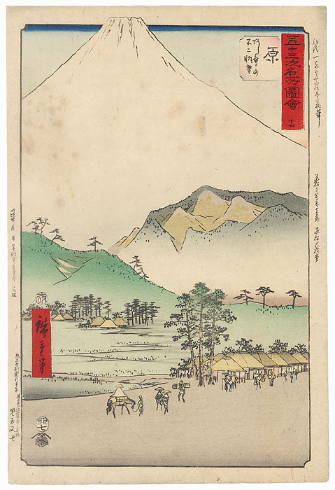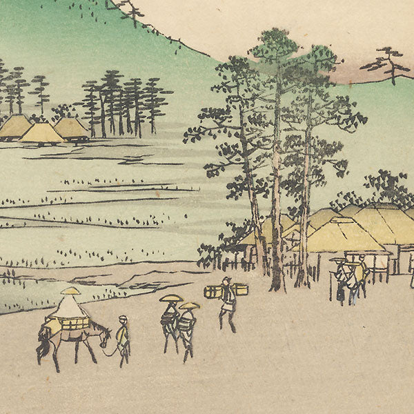 Pictures of Famous Places on the Fifty-three Stations (Vertical Tokaido) - Hiroshige's fantastic vertical Tokaido series was done in 1855 and represents a further evolution of his landscape design style, including some of his most modern designs. One of the striking features of this beautiful series was the vertical format, since the more common format for the landscape print was the horizontal. This unique approach allowed Hiroshige to experiment with the foreground and background contrasts that are typical of his work and seen in some of his other vertical landscape series. The concept for the vertical Tokaido grew out of the incredible popularity of the Great Tokaido (his first Tokaido series). Hiroshige wanted to expand on the theme, as the public was very interested in his fascinating images of life and travels along the most important thoroughfare in Japan- the road from Edo to Kyoto. From the urban center of Edo, where the journey began, to the beautiful rural landscape of the provinces more far away, the series is a set of handsome illustrations of Edo period Japan. This print is from the 1891 Memorial Edition of the series.
